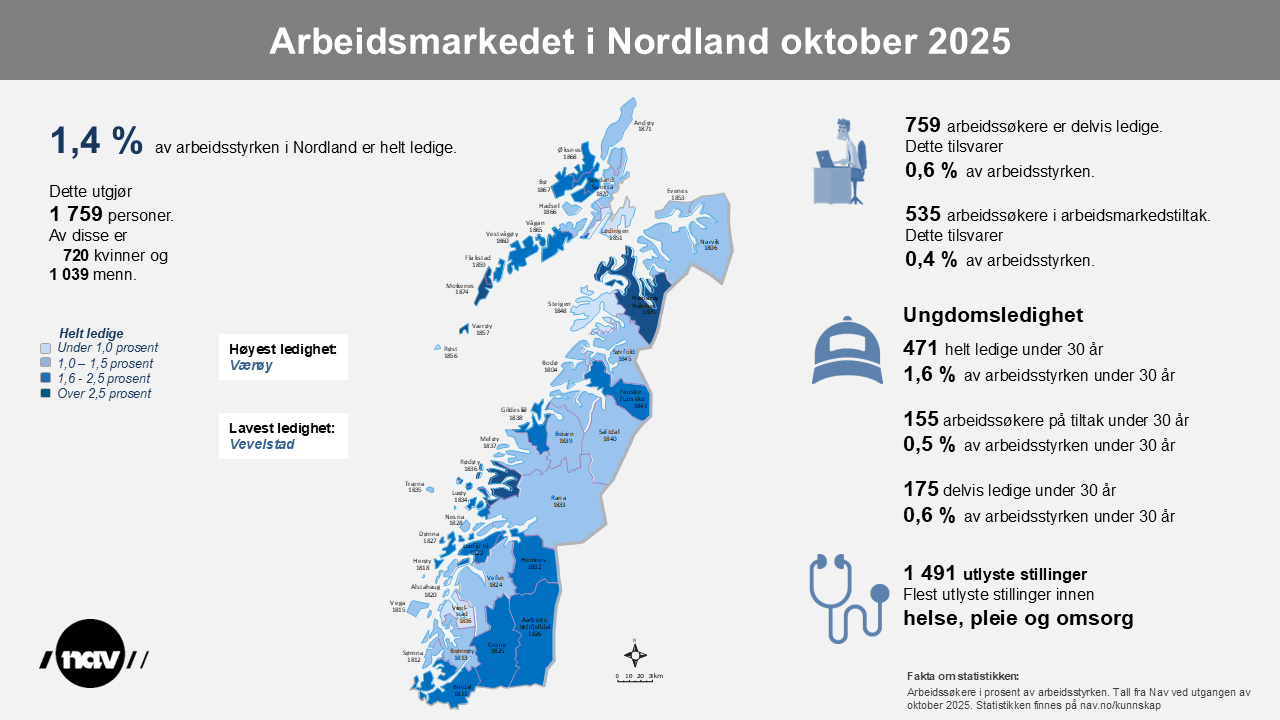 Ved utgangen av oktober er det 1 759 helt ledige arbeidssøkere i Nordland, noe som tilsvarer 1,4 prosent av arbeidsstyrken. Etterspørselen etter arbeidskraft har gått noe ned fra i fjor, men er fortsatt høy med 1 491 utlyste stillinger i oktober. Det vil si at det er 1,2 helt ledige arbeidssøkere per ledig stilling.