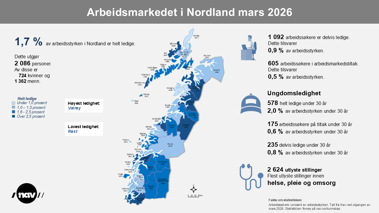 Ved utgangen av mars er det 2 086 helt arbeidsledige i Nordland. Det utgjør 1,7 prosent av arbeidsstyrken. I tillegg til de helt ledige er det 605 arbeidssøkere på tiltak og 1 092 delvis ledige arbeidssøkere. Dermed har Nordland totalt 3 783 arbeidssøkere, noe som utgjør 3,1 prosent av arbeidsstyrken.
