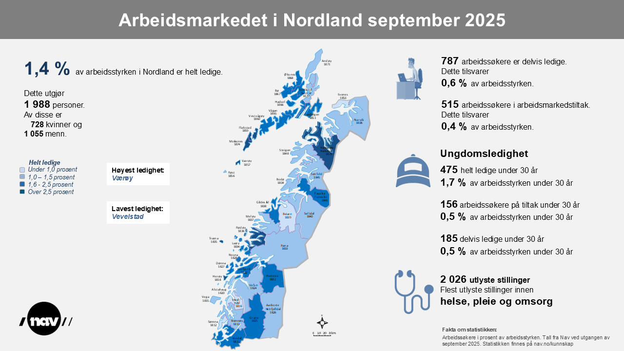 Ved utgangen av september er det 1 783 helt ledige arbeidssøkere i Nordland, noe som tilsvarer 1,4 prosent av arbeidsstyrken. Av disse er 416 personer langtidsledige, som vil si at de har vært helt uten arbeid eller tiltak i 26 uker eller mer. Samtidig er det fortsatt stor etterspørsel etter arbeidskraft i Nordland, med 2 026 utlyste stillinger i september.