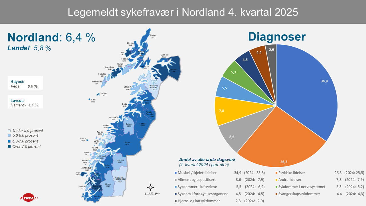 Fylkets laveste legemeldte sykefravær finner vi i Hamarøy som har 4,4 prosent sykefravær, mens Vega har høyest legemeldt sykefravær med 8,8 prosent sykefravær.