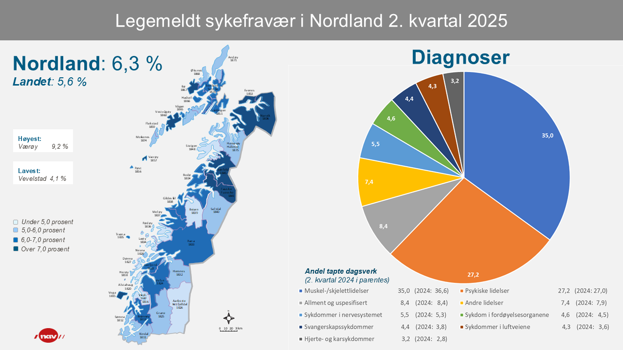 Ser vi på alle aldersgrupper hadde Nordland et sykefravær på 6,3 prosent, som er stabilt fra 2. kvartal 2024.