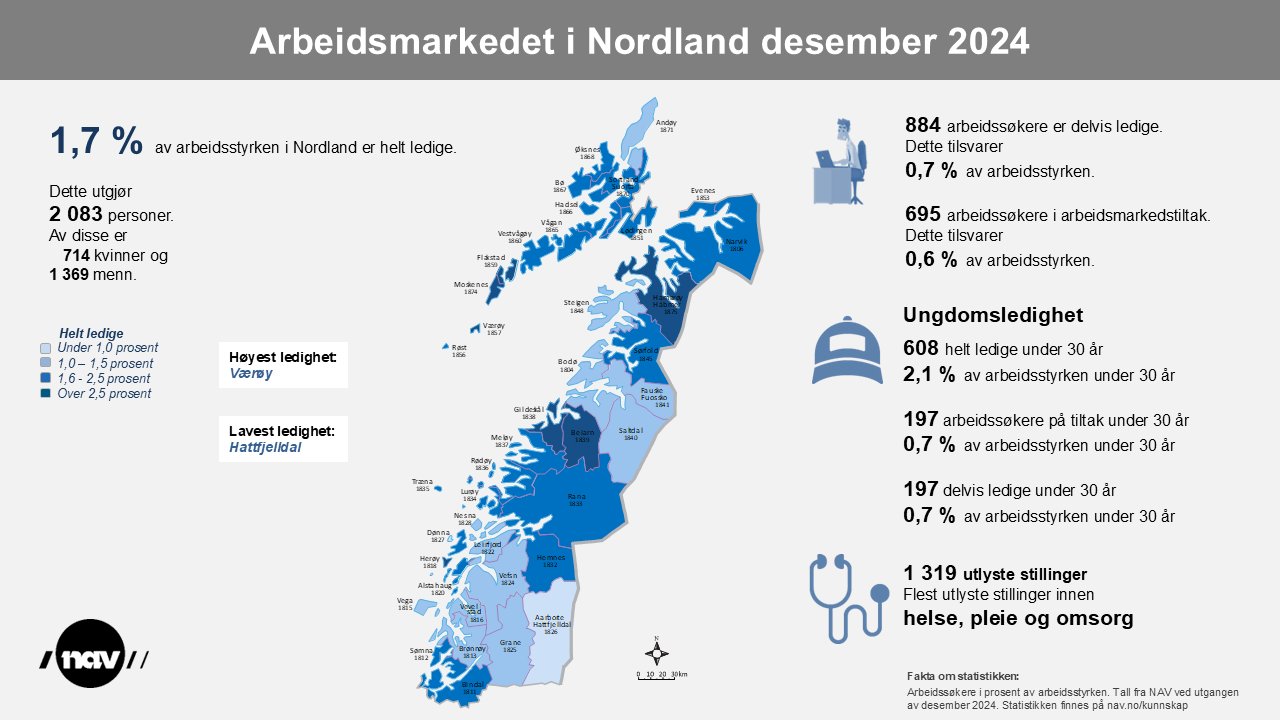 Ved utgangen av desember er det 2 083 helt ledige arbeidssøkere i Nordland. I tillegg er det 884 delvis ledige og 695 arbeidssøkere på tiltak. Dermed er det totalt 3 662 arbeidssøkere i Nordland, noe som utgjør 3 prosent av arbeidsstyrken. Det er 509 flere arbeidssøkere enn samme måned i fjor, som tilsvarer en økning på 16 prosent.