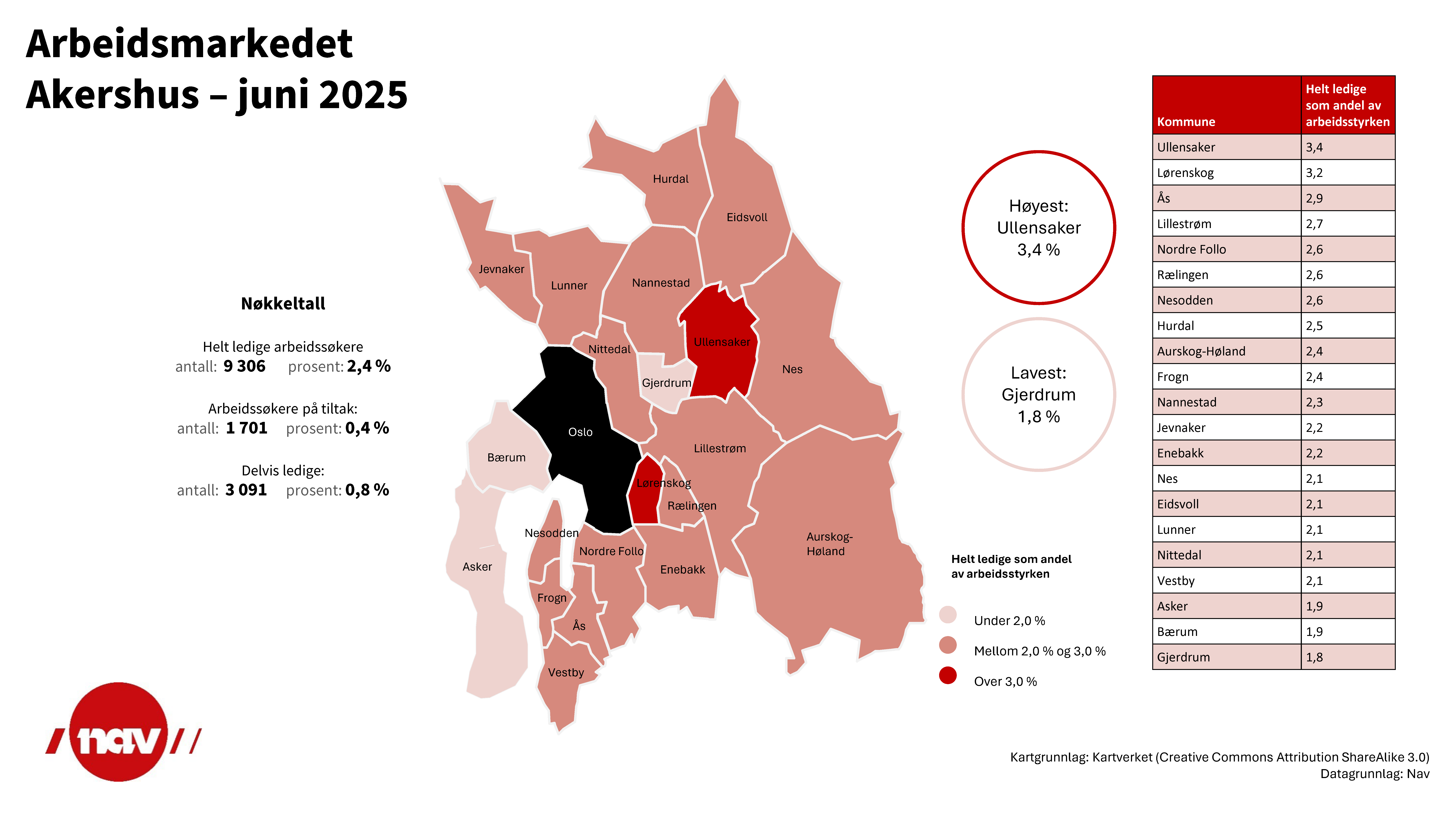 Ullensaker har høyest andel helt ledige av kommunene i Akershus med 3,4 prosent, mens Gjerdrum har lavest andel med 1,8 prosent helt ledige.