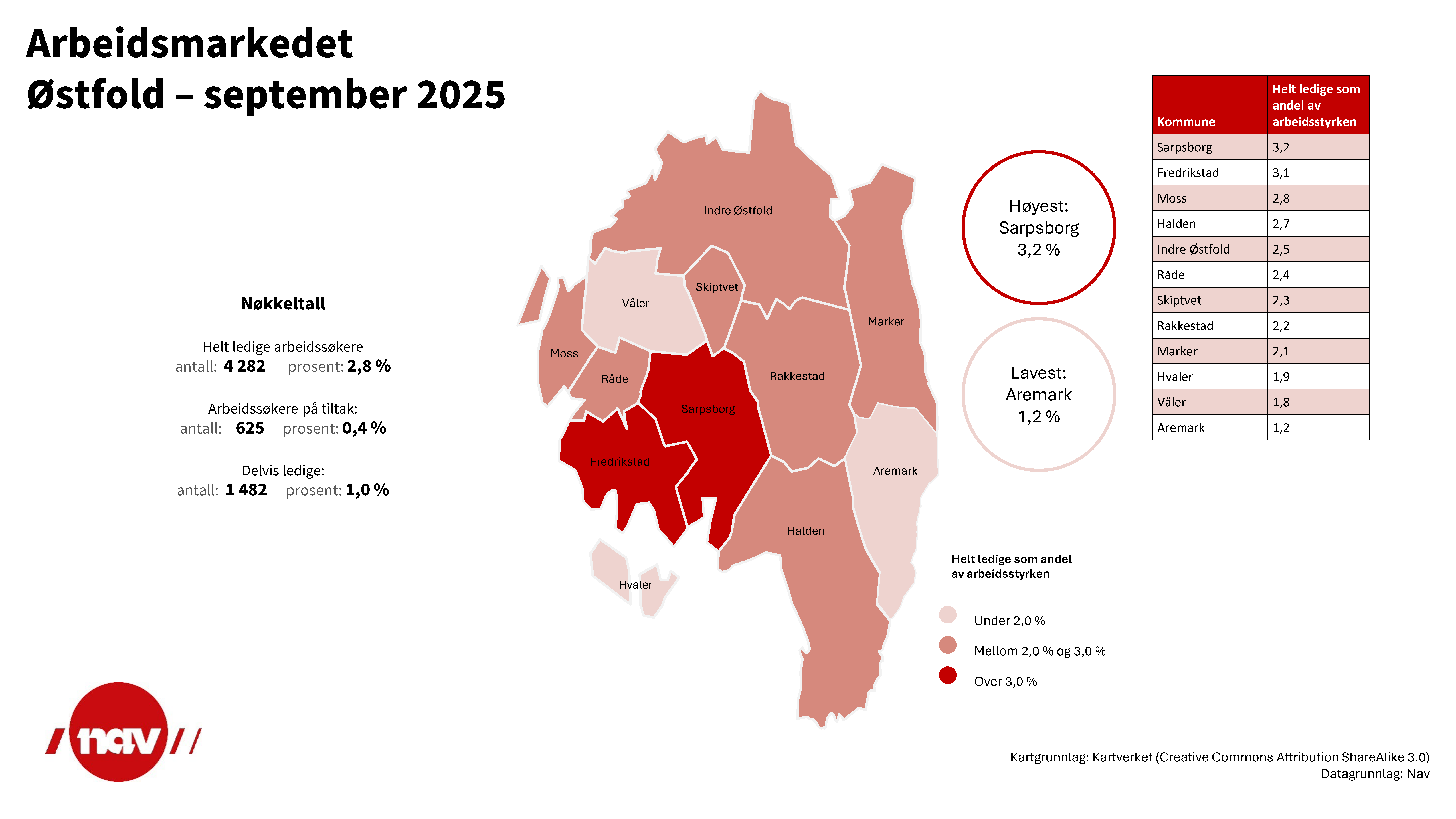 Ved utgangen av september var 2,8 prosent av arbeidsstyrken i Østfold registrert som arbeidsledig. Det er en svak nedgang siden august, men forskjellen mellom kommunene er betydelig.