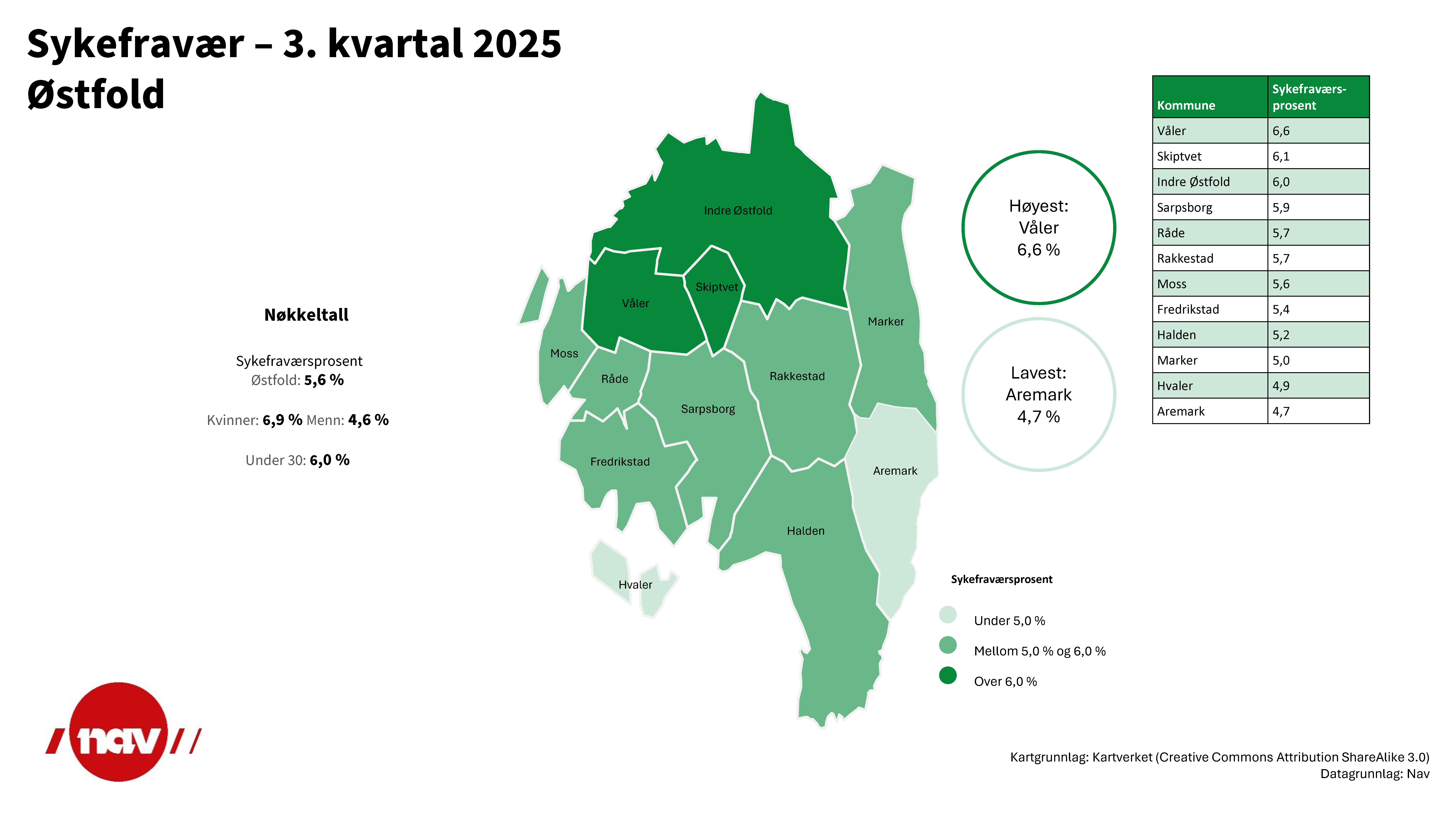Våler kommune har det høyeste sykefraværet i Østfold med 6,6 prosent. Aremark har den laveste sykefraværsandelen med 4,7 prosent.