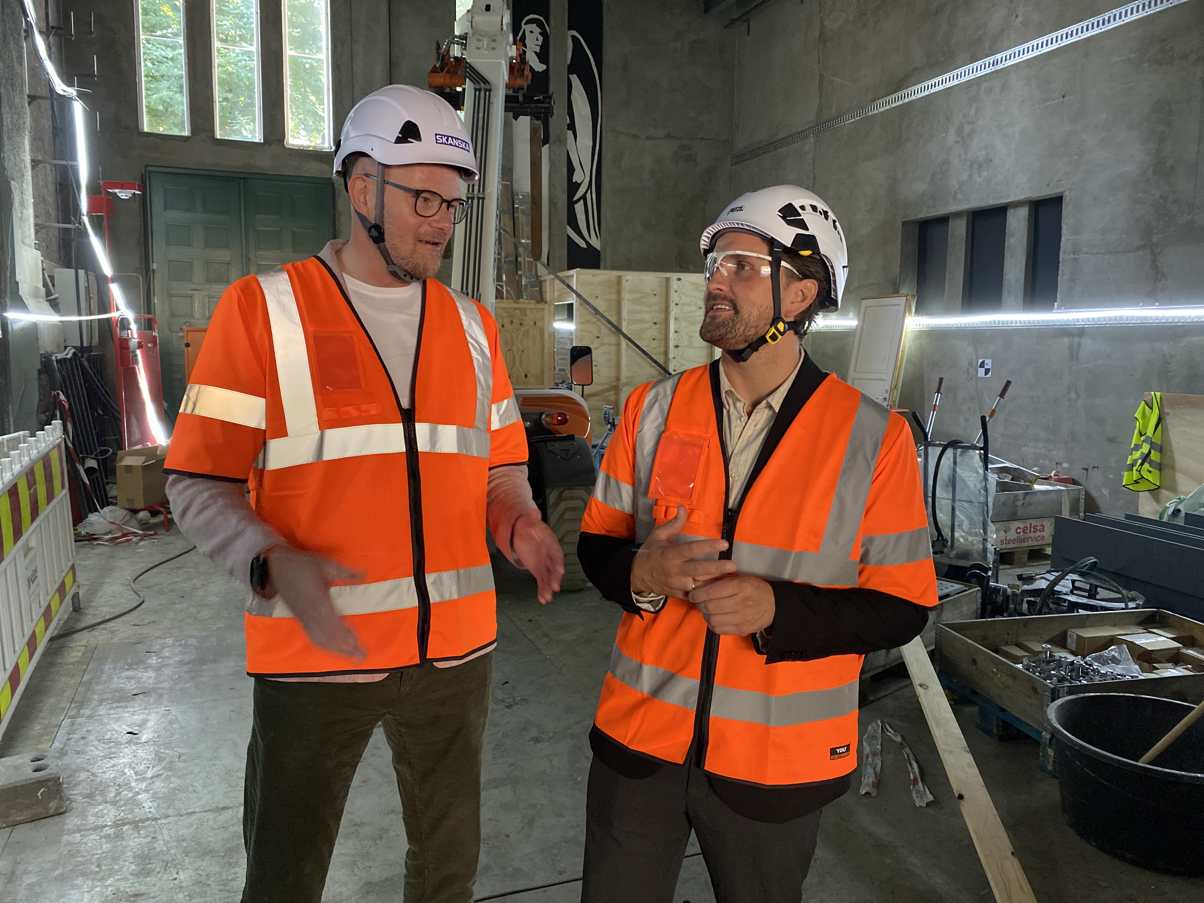 - Fylkesdirektør i Nav Bjarte Hysing-Olsen (t.v.) og administrerande direktør i EBA Vestenfjelske Vegard B. Vike på Den Nationale Scene, eit av mange bygg i Vestland som er under rehabilitering. (Foto: Nav)