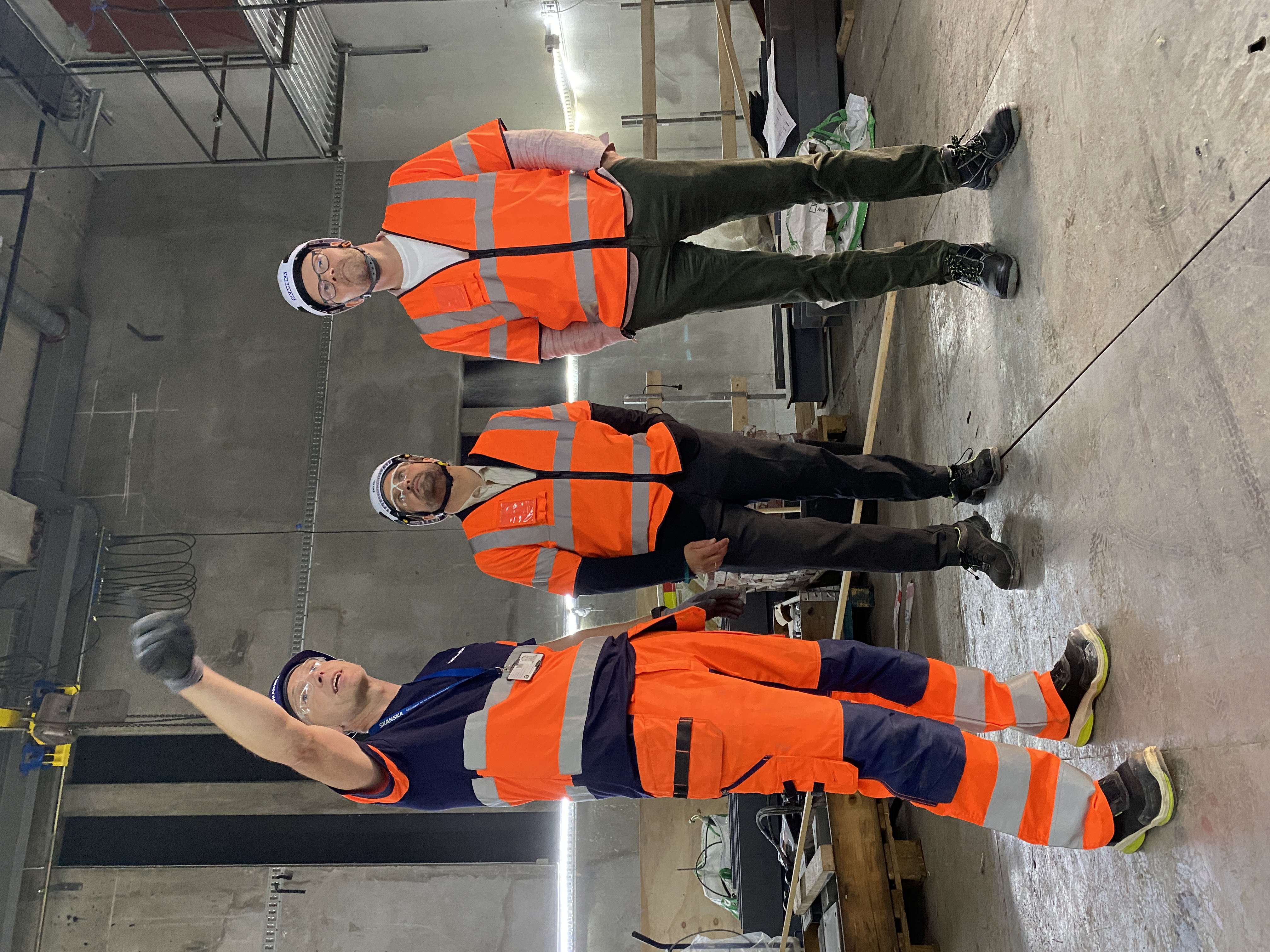 - Anleggsleiar Ørjan Andersen (f.v.) frå Skanska fortel Vegard B. Vike frå EBA Vestenfjelske og Bjarte Hysing-Olsen frå Nav om byggearbeidet på Den Nationale Scene. (Foto: Nav)