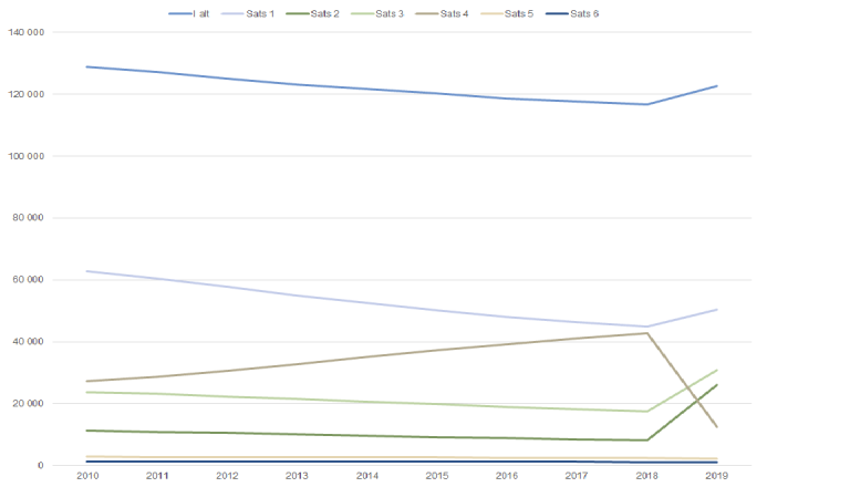 Andelen med sats 3 økte fra 15 % i 2018 til 25 % i 2019 (30 700 personer).