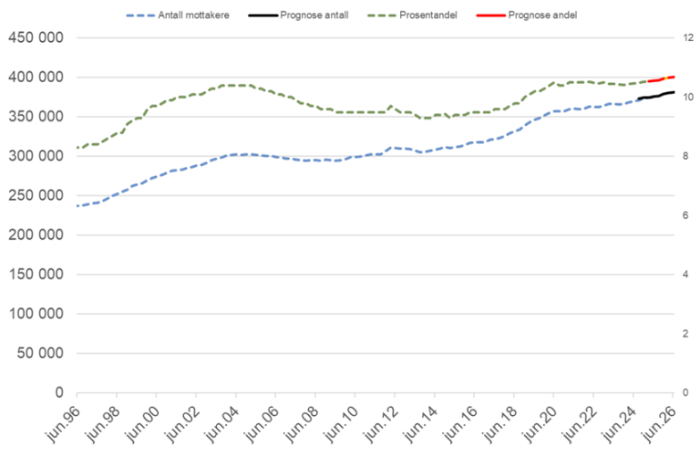 – Nav har laget en ny prognose for utviklingen i antall personer med uføretrygd i 2025 og 2026. Vi forventer 376 840 mottakere av uføretrygd i desember 2025 og 382 850 mottakere i desember 2026. Noe som tilsier en prosentandel på 10,6 ved utgangen av 2025 og 10,7 prosent ved utgangen av 2026, sier Arbeids- og velferdsdirektør Hans Christian Holte.