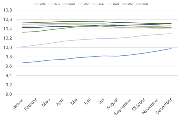 Antall uføre i prosent av befolkning i alderen 18-67 år var på 10,5 prosent, samme andel som forrige måned, utgangen av forrige kvartal og utgangen av desember 2024.