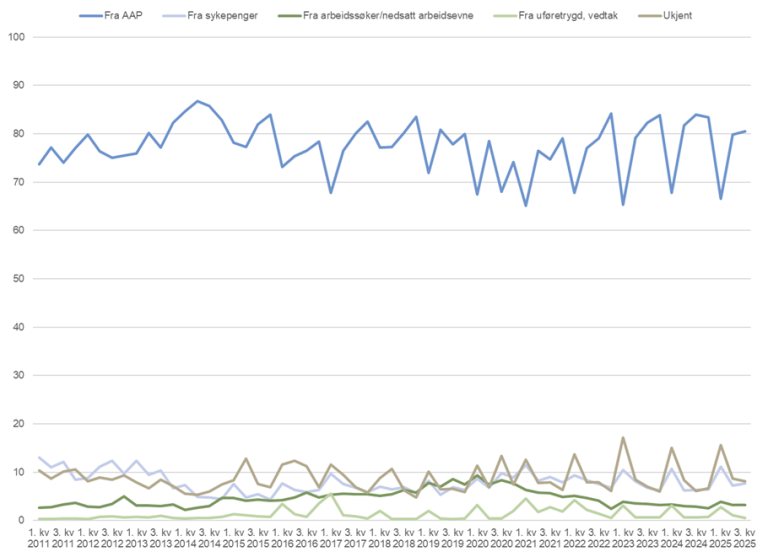 Den kvartalsvise tilgangen styres i stor grad av hvor mange nye uføremottakere som kommer fra AAP og vi ser at det er variasjoner fra kvartal til kvartal. Variasjonen i AAP-andelen skyldes hovedsakelig regelverksendringer og saksbehandlingen av AAP-saker, som får stor betydning for tilgangen til uføretrygd. Som følge av koronapandemien var overgangen fra AAP til uføretrygd noe lavere i 2020 og 2021 sammenlignet med tidligere og seinere år. Dette skyldes bla. at personer som nærmet seg slutten av AAP-perioden fikk forlenget den på grunn av midlertidige endringer i AAP-regelverket under koronakrisen. Andelen nye uføretrygdede som kom fra AAP i 3. kvartal 2025 var på 80,5 prosent. Det var en økning på 3,5 prosentpoeng fra samme kvartal i 2024. Andelen for perioden 1.-3. kvartal var på 75 prosent. 2,6 prosentpoeng lavere enn samme periode i 2014.