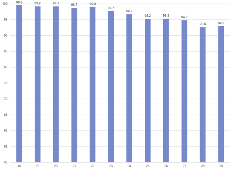 Uføregrad sier noe om helsetilstanden til den uføretrygdede. Om lag alle uføretrygdede mellom 18-29 år mottar 100 prosent ytelse fra Nav. 99,6 prosent av 18-åringene mottok 100 prosent uføretrygd, mens 99,2 prosent av 19-åringene og 99,1 prosent av 20-åringene mottok full ytelse. Fra 21-års alder faller uføregraden noe og vi ser at 92,9 prosent av 29-åringene mottok full ytelse. Andelene er nokså stabile over tid.