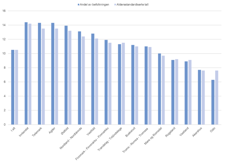 * Aldersstandardisering. Det er den direkte metode for aldersstandardisering som benyttes etter 1-årig alder, og viser fordelingen (andelen) i det enkelte fylke om aldersfordelingen var som for landet. Figuren viser da en høyere eller lavere (evt. uendret) andel enn tallserien med «Andel av befolkningen».