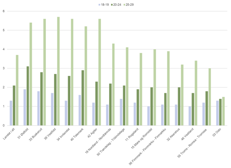 Figur 7. Antall unge uføretrygdede 18-29 år i prosent av befolkningen for hver aldersgruppe etter fylke. 30.09.2025. Prosent.