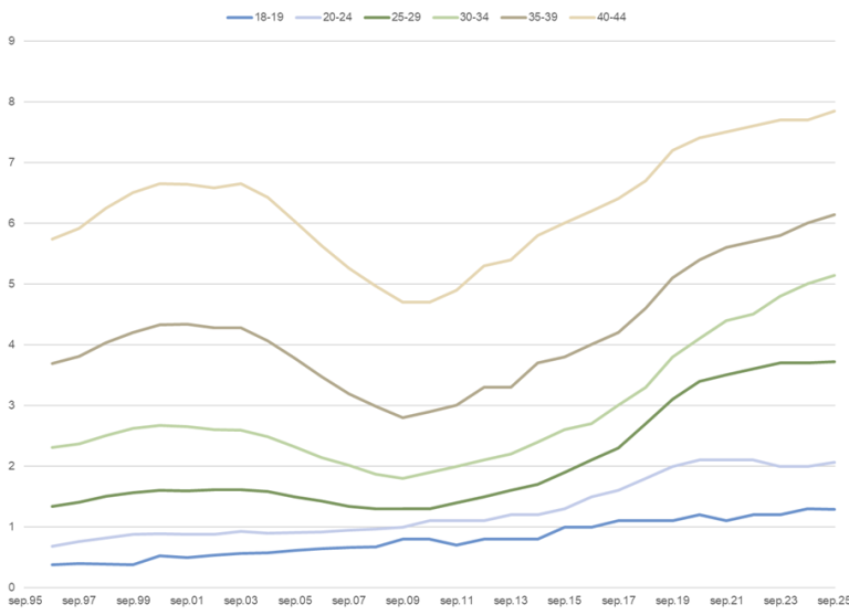 Figur 6. Unge uføre som andel av befolkningen (18-29 år). Per 30.09.1996 – 30.09.2025. Prosent*