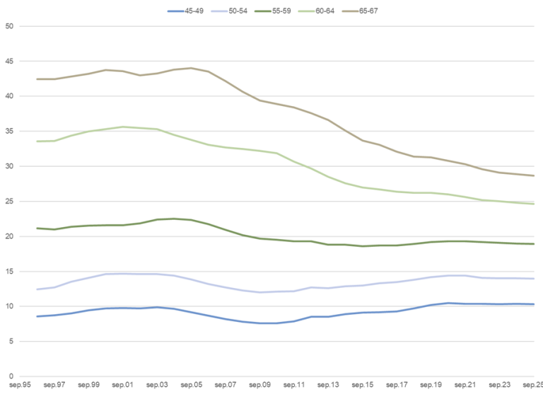 Figur 5. Mottakere av uføretrygd som andel av befolkningen 18-67 år. Per 30.09.1996 – 30.09.2025. Prosent.