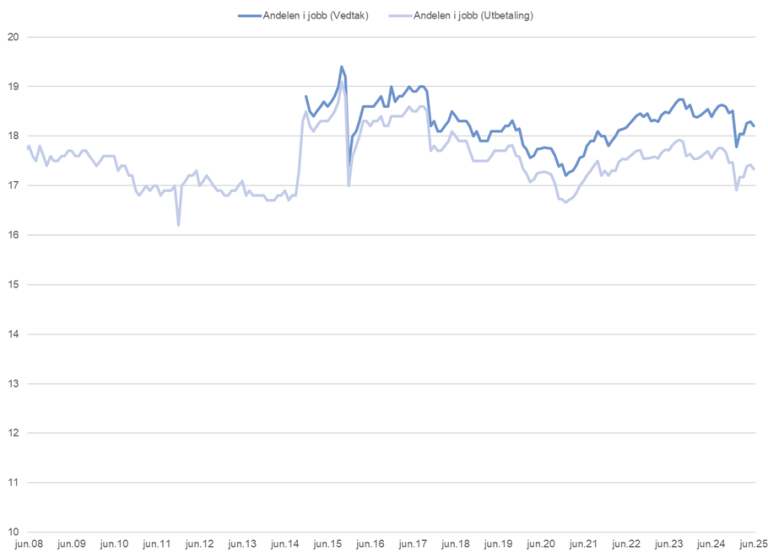 Figur 9. Andelen uføre (18-67 år) registrert med et arbeidsforhold (vedtak og utbetaling). Per måned. 30.06.2008 – 30.06.2025. Prosent.