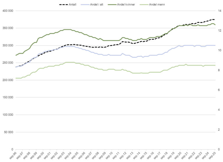 Per september 2025 var det registrert 374 800 mottakere av uføretrygd. Det var en nedgang på 35 personer siden utgangen av forrige kvartal. Sammenlignet med samme tidspunkt i fjor var det en økning på 3 600 personer.