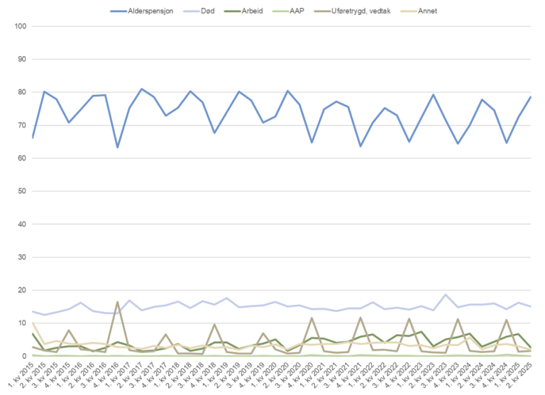 Det er også noen som har avgang fra uføretrygd som følge av for høye inntekter ved siden av uføretrygden. Disse personene havner i statusen «uføretrygd, vedtak». Siden uføretrygd beregnes som en «årsytelse», ser vi at det er flere som faller ut av «ytelsestellingen» mot slutten av året og gjør at avgangen fra uføretrygd ser ut til å være høyest da. I 2. kvartal 2025 var denne andelen på 1,6 prosent, en økning på 0,3 prosentpoeng sammenlignet med samme kvartal i 2024.