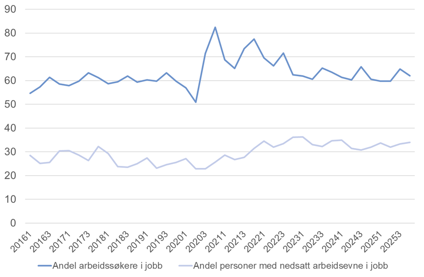 Det var i alt 37 737 arbeidssøkere, og 17 037 personer med nedsatt arbeidsevne som hadde avgang fra sin status som henholdsvis arbeidssøker og nedsatt arbeidsevne 2. kvartal 2025. Etter 6 måneder var 62 prosent av arbeidssøkerne og 34 prosent av de personer som var registrert med nedsatt arbeidsevne registrert i jobb. I tillegg kombinerte om lag 8 prosent av arbeidssøkere og 15 prosent av personene med nedsatt arbeidsevne arbeid med stønad og/eller oppfølging fra Nav.