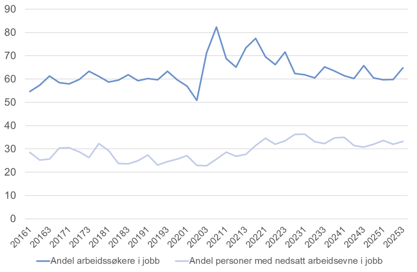 Det var i alt 43 969 arbeidssøkere, og 17 785 personer med nedsatt arbeidsevne som hadde avgang fra sin status som henholdsvis arbeidssøker og nedsatt arbeidsevne 1. kvartal 2025. Etter 6 måneder var 64,8 prosent av arbeidssøkerne og 33,3 prosent av de personer som var registrert med nedsatt arbeidsevne registrert i jobb. I tillegg kombinerte om lag 6,9 prosent av arbeidssøkere og 14,6 prosent av personene med nedsatt arbeidsevne arbeid med stønad og/eller oppfølging fra Nav.