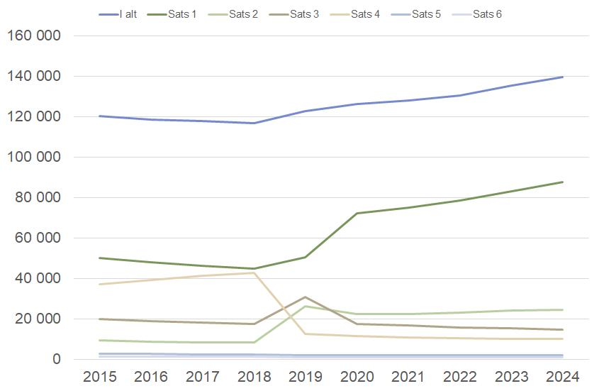 Også bruken av sats 3 har vært påvirket av regelendringene. Andelen med sats 3 økte fra 15 prosent i 2018 til 25 prosent i 2019. Deretter har andelen sunket, og i 2025 mottok om lag 10 prosent av alle med grunnstønad sats 3 (14 200 personer).