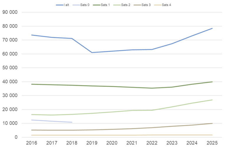 Det er spesielt blant personer med sats 2 at antall og andel mottakere har økt det siste året fra 24 600 personer til 27 000 i juni 2025.