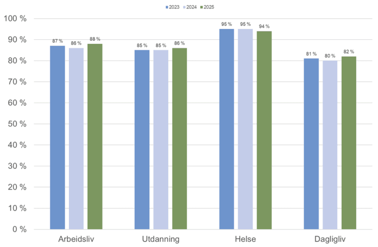 Av de fire kategoriene er behovet størst innen dagligliv og minst innen utdanning. Behovet for tolk i utdanning har gått merkbart ned de siste årene. Her vises hvor mange tolkeressurser det til sammen var behov for innen de ulike kategoriene i 2025: