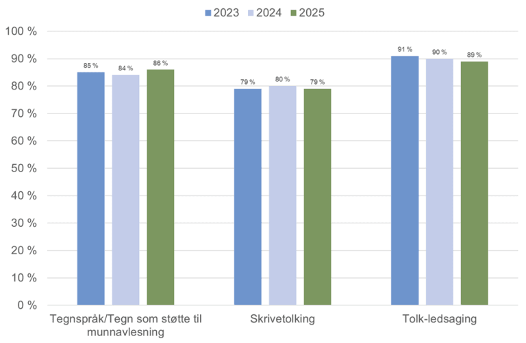 Tolking og ledsaging for personer med kombinert syns- og hørselshemming har høyest dekningsgrad. Frilanstolker dekker de fleste av disse tolkebehovene, og i 2025 var dekningsgraden for tolk-ledsaging 89 prosent.
