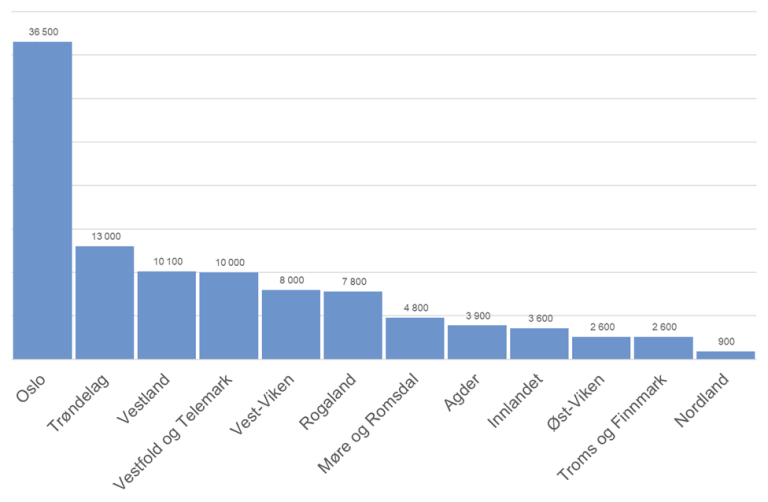 Oslo er fylket med størst tolkebehov: 34 prosent av alle tolkebestillingene i Norge er i Oslo. Deretter følger Trøndelag (12 %), Vestland (9 %) og Vestfold og Telemark (9 %).