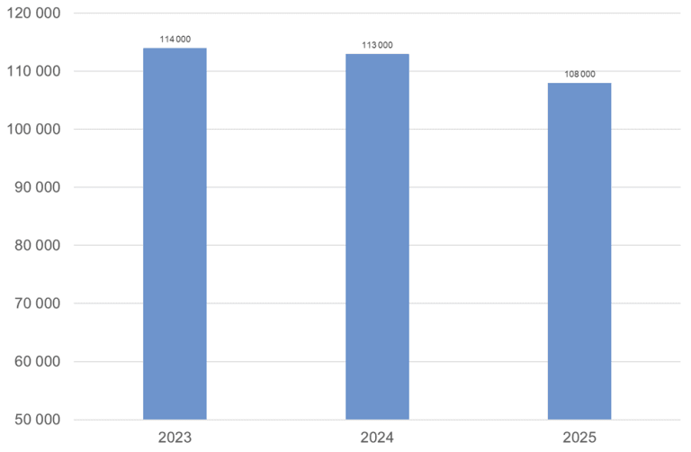 I 2025 kom det bestilling på 108 00 tolkeressurser i Nav. 21 prosent av bestillingene ble deretter avbestilt. Det bestilte tolkebehovet har vært økende gjennom mange år frem til 2023, deretter har det sunket noe, som vist i figur 1.
