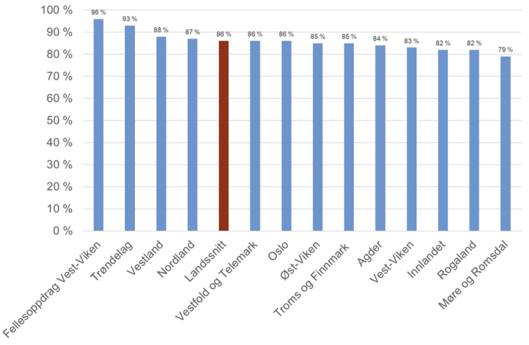 Dekningsgraden har vært stabil de siste tre årene på 85-86 prosent. Den landsdekkende dekningsgraden viser gjennomsnittet for hele landet og alle tolkemetodene.